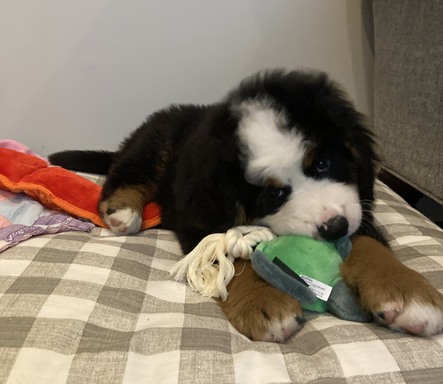 Just so cute, and those paws! Kristen Hine's Rosiland is a bit bigger now, but I bet she still enjoys a good toy! Rosalind's B-G Dog ID Rosalind's B-G Pedigree 12/06/25 |