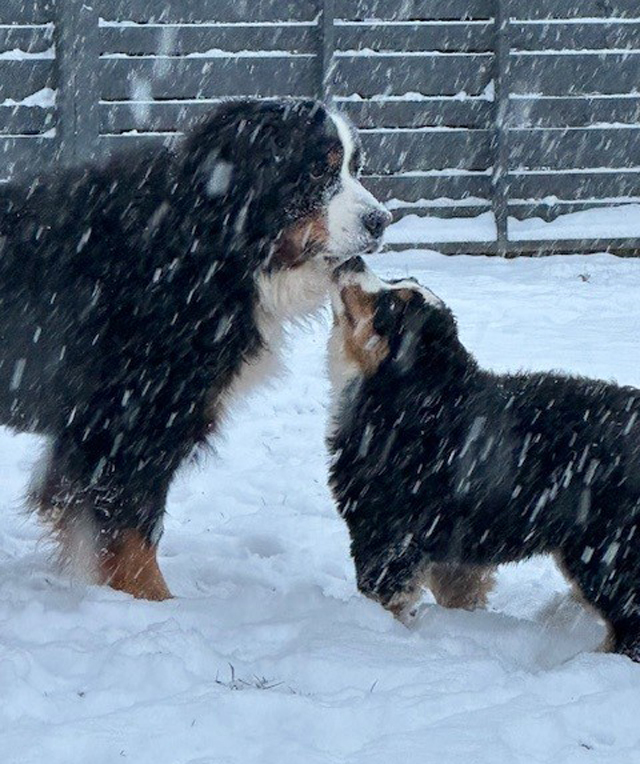Introductions matter! Lisa Ellis' Fritz takes his role as big brother seriously when he introduces Eloise to - SNOW! Fritz's B-G Dog ID Fritz's B-G Pedigree Eloise's B-G Dog ID Eloise's B-G Pedigree 03/03/26 |
