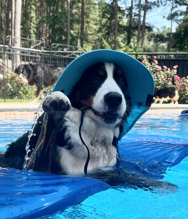 Enjoying some supervised playtime! Anne-Marie Cotton's Mishka enjoys her pool time with a raft and an excellent hat to protect her from the bright sun! Mishka's B-G Dog ID Mishka's B-G Pedigree 04/18/26 |