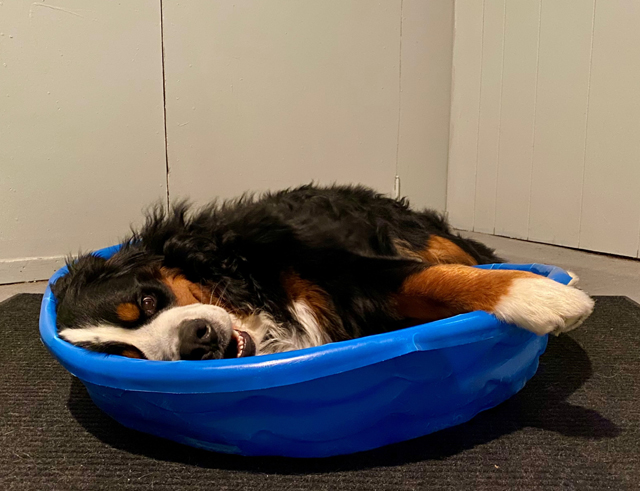 It's not easy keeping cool! Lauren Miller's Archie had hoped for some cool water, but he likes his pool any way he can get it! Archie's B-G Dog ID Archie's B-G Pedigree 08/07/25 |