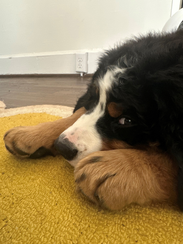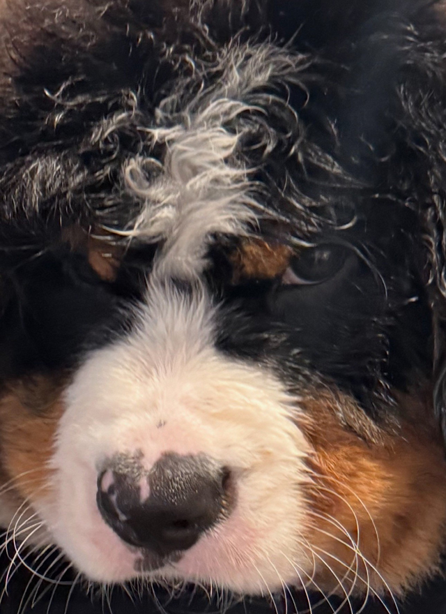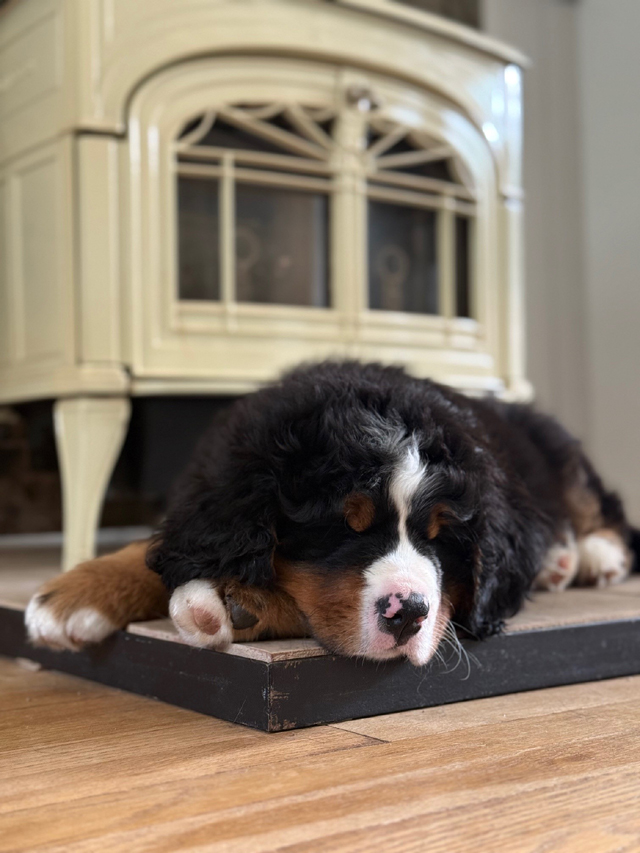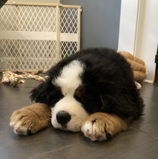 Growing is hard work! Kristen Hine's Rosalind is going to have to do some major growing in order to fit into those paws properly! Rosalind's B-G Dog ID Rosalind's B-G Pedigree 08/15/25 |