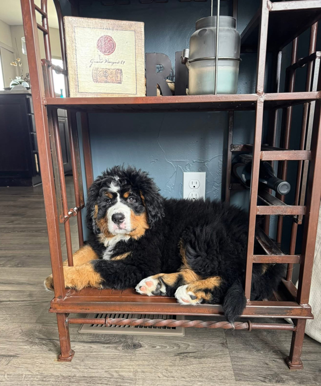 It's a perfect spot - for now! Tricia Klaus' Tellie has squished herself into a spot that she may not be able to use for very much longer! Tellie's B-G Dog ID Tellie's B-G Pedigree 08/20/25 |