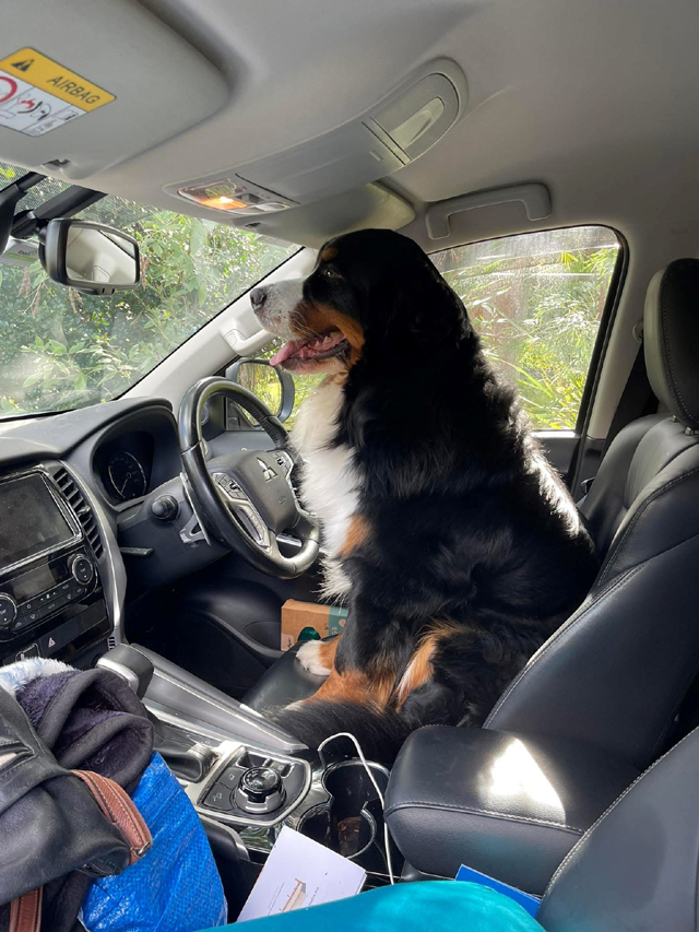 He's on the right side - literally! But does Annie Bell's Duncan have the right license, or is he just enjoying the view! Duncan's B-G Dog ID Duncan's B-G Pedigree 08/30/25 |