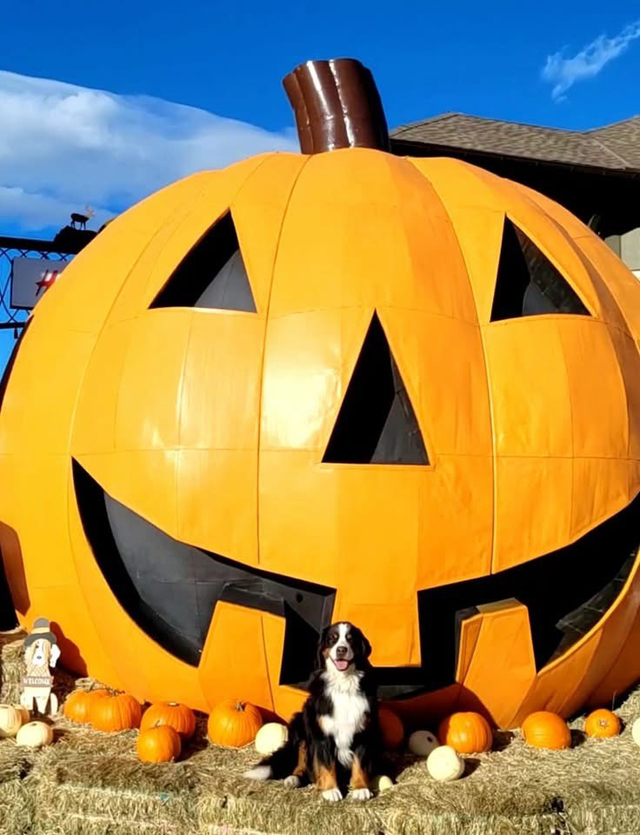 Perfect camouflage! Cathy Sullivan-Neves' Spirit found a pumpkin patch in which to hide - since they wouldn't let him drive the tractor! Spirit's B-G Dog ID Spirit's B-G Pedigree 10/19/25 |