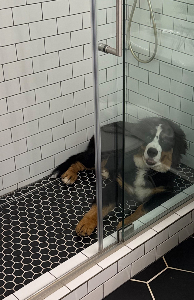 While we're on the subject of goofballs...! Jennifer Carmenate-Dale and Elizabeth Fletcher's Benny thinks the shower makes an excellent hiding spot - he'll learn! Benny's B-G Dog ID Benny's B-G Pedigree 10/25/25 |