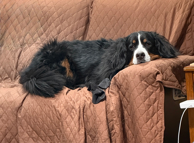 A diligently working dog! Sue Beagley's Bessie knows what work is most important, and likes to ensure she does is thoroughly! Bessie's B-G Dog ID Bessie's B-G Dog ID 03/15/26 |