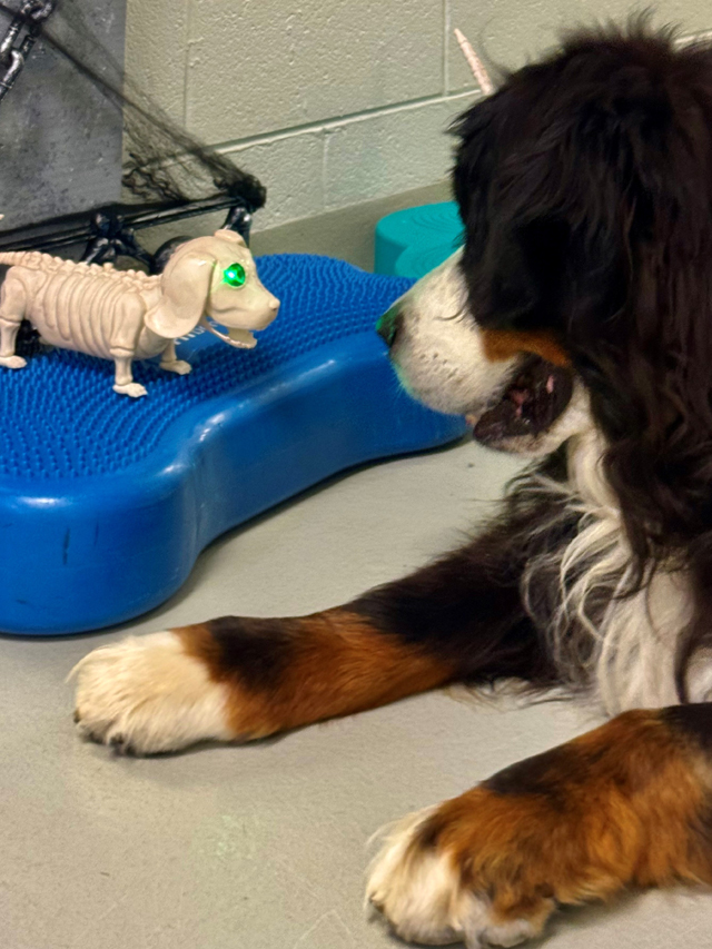 As if the vet's office weren't already scary enough! Elizabeth Fletcher's Keeper looks askance at a demonic dog skeleton at the vet's office! Keeper's B-G Dog ID Keeper's B-G Pedigree 11/03/24 |