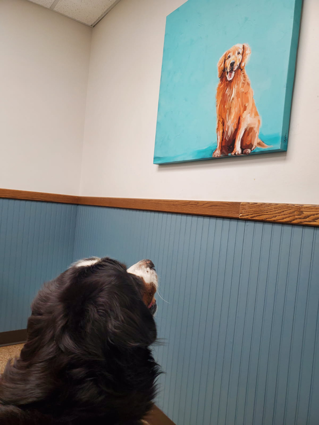The nose knows! Amy Pannell tried to convince Quigley they were going to an art gallery, but he knows a vet's office when he smells it! Quigley's B-G Dog ID Quigley's B-G Pedigree 09/11/25 |