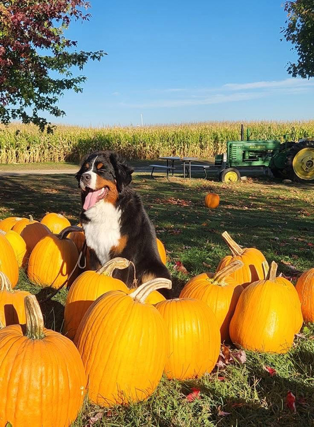 Perfect camouflage! Cathy Sullivan-Neves' Spirit found a pumpkin patch in which to hide - since they wouldn't let him drive the tractor! Spirit's B-G Dog ID Spirit's B-G Pedigree 10/19/25 |