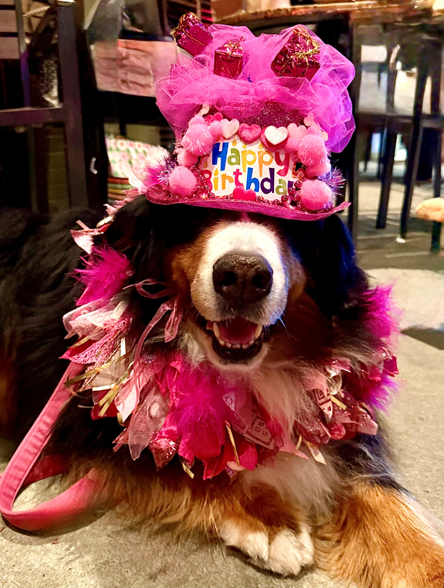 Celebration time! Jill Raymond's Nellie Belle had a big grin on her 11th birthday in spite of the birthday frippery! Nellie Belle's B-G Dog ID Nellie Belle's B-G Pedigree 11/16/25 |
